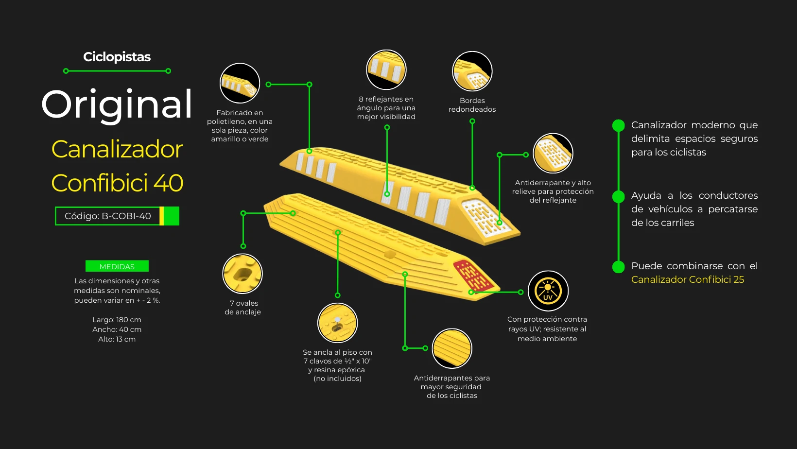 With 7 oval holes to anchor, the confibici 40 offer a durable and safe structure for its installation in bike ways.