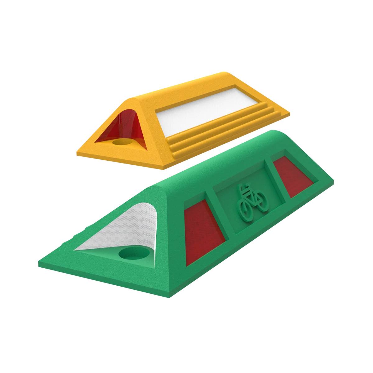 These are part of the horizontal road signage placed on pavement and used to channelize bike ways, delimit lanes and other functions, very useful and convenient, attracting people’s attention with the reflective elements.